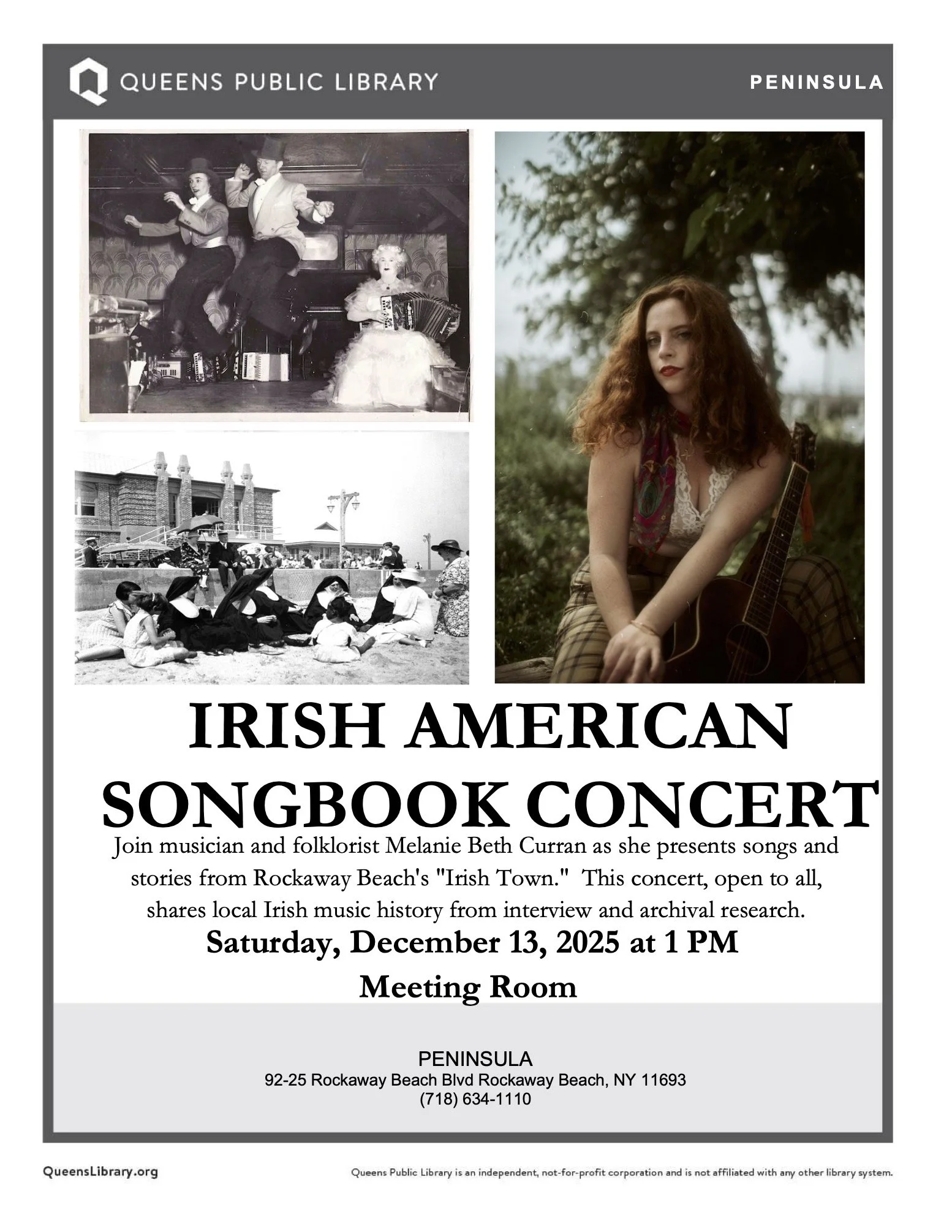 Dec 13 - Rockaway Beach, New York - Irish American Songbook Concert, Queens Public Library, Peninsula Branch 1-3pm